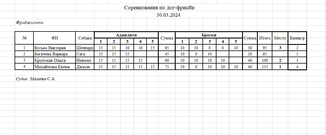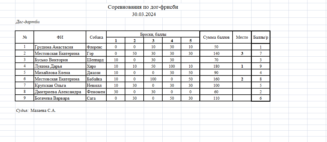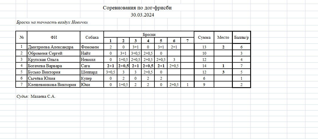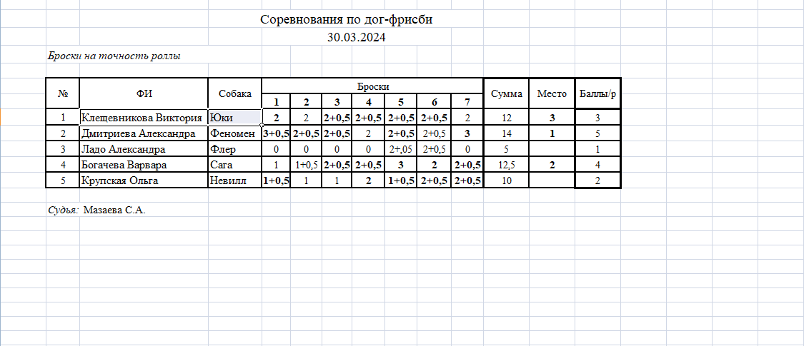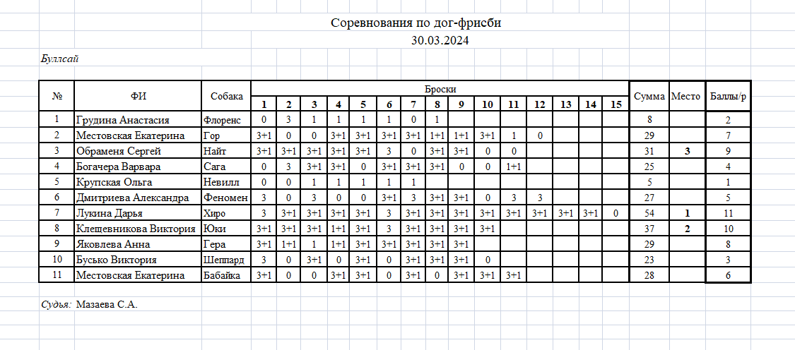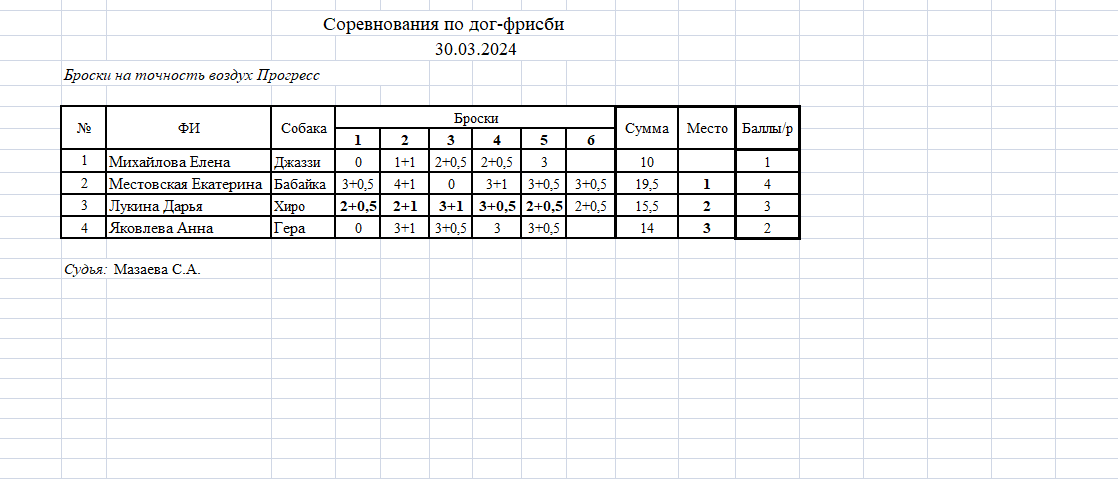 - Если собака поймала диск в центральной обозначенной зоне, то начисляется бонус 0,5 балла.