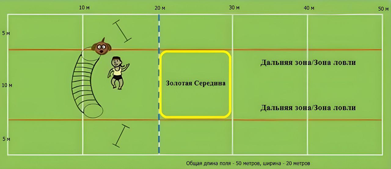 - Бросок засчитывается, если во время ловли диска хотя бы одна лапа собаки находилась внутри границ соревновательного поля. Если ловля произошла ровно на границе двух зон, засчитывается зона, ближайшая к стартовой линии.